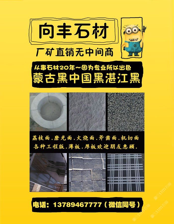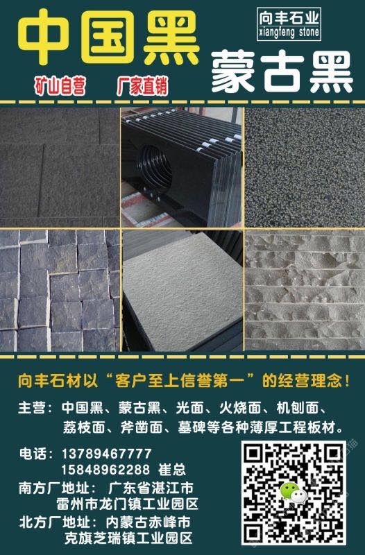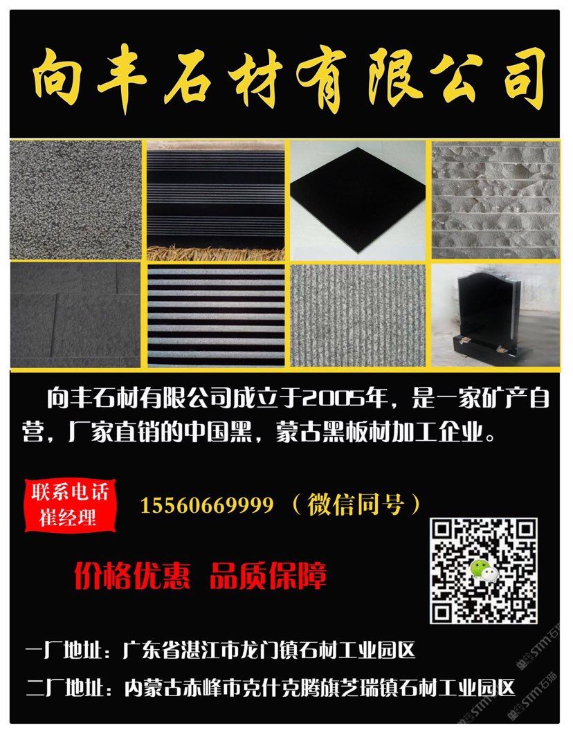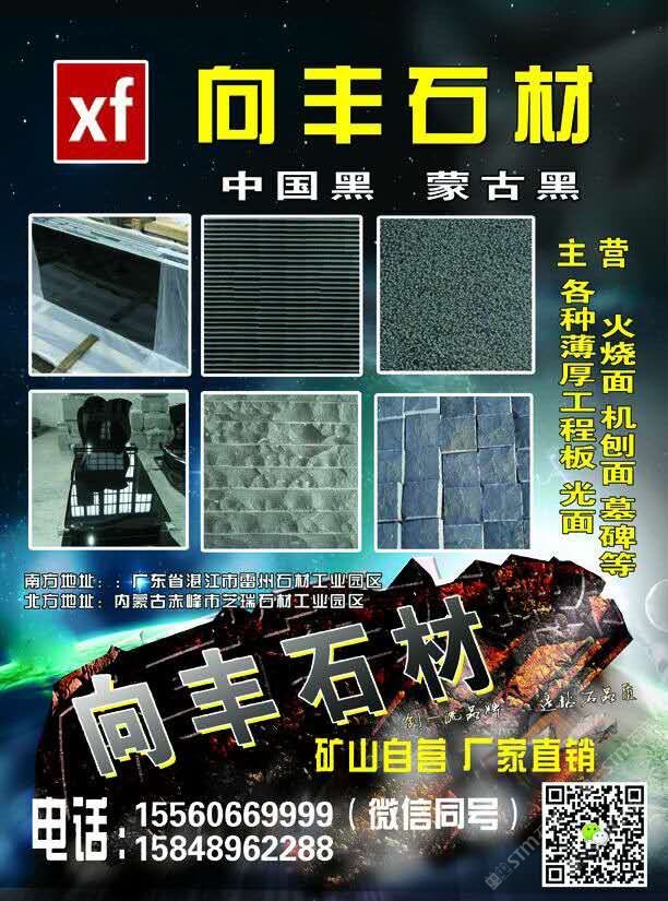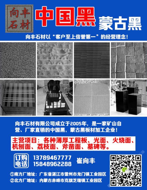 向豐石材有限公司成立于2005年,是一家礦山自營的蒙古黑板材加工企業(yè)!主營項(xiàng)目:各種薄厚工程板、光面、火燒面、機(jī)刨面、荔枝面、斧鑿面、墓碑等。向豐石材以“客戶至上信譽(yù)”的經(jīng)營理念,先進(jìn)的技術(shù)和現(xiàn)代化管理為基石,不斷的開拓創(chuàng)新與時(shí)俱進(jìn)?,F(xiàn)已經(jīng)發(fā)展為南北方跨區(qū)域生產(chǎn)企業(yè),至今完成多個(gè)大型項(xiàng)目并多次中標(biāo)。高效的生產(chǎn),優(yōu)質(zhì)的產(chǎn)品得到業(yè)主單位的好評,樹立了良好的企業(yè)形象。我們堅(jiān)信,以“質(zhì)量求生存,誠信為根本”一定會(huì)贏得更好的明天!