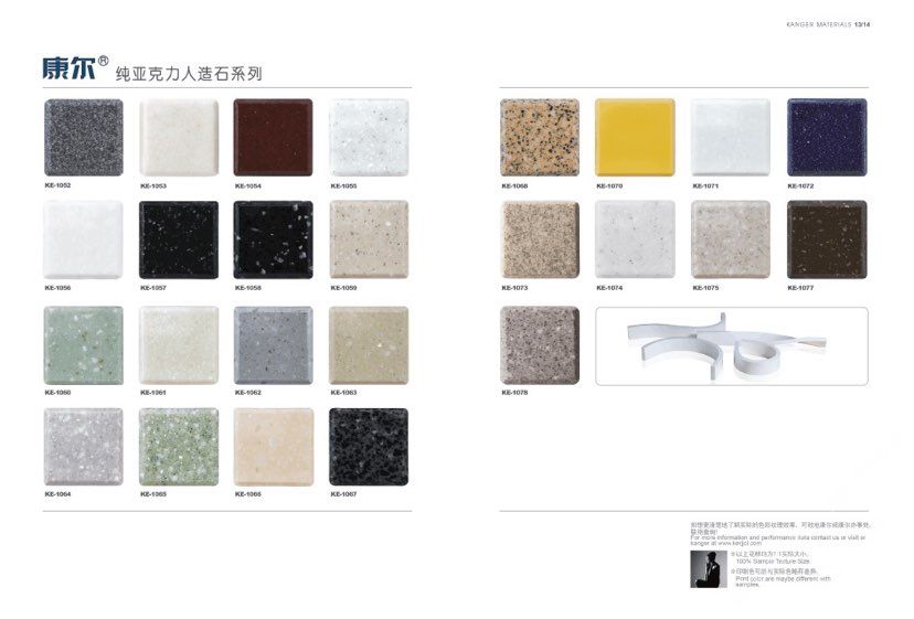 康爾人先后開發(fā)出了色彩豐富的 100% 純亞克力系列,復(fù)合亞克力系列,不飽和樹脂系列,石英石、集成成品臺面和高分子復(fù)合材料門板系列。產(chǎn)品系列多樣、顏色豐富、品質(zhì)穩(wěn)定、已銷往世界幾十個國家,深受國內(nèi)外客戶的好評.