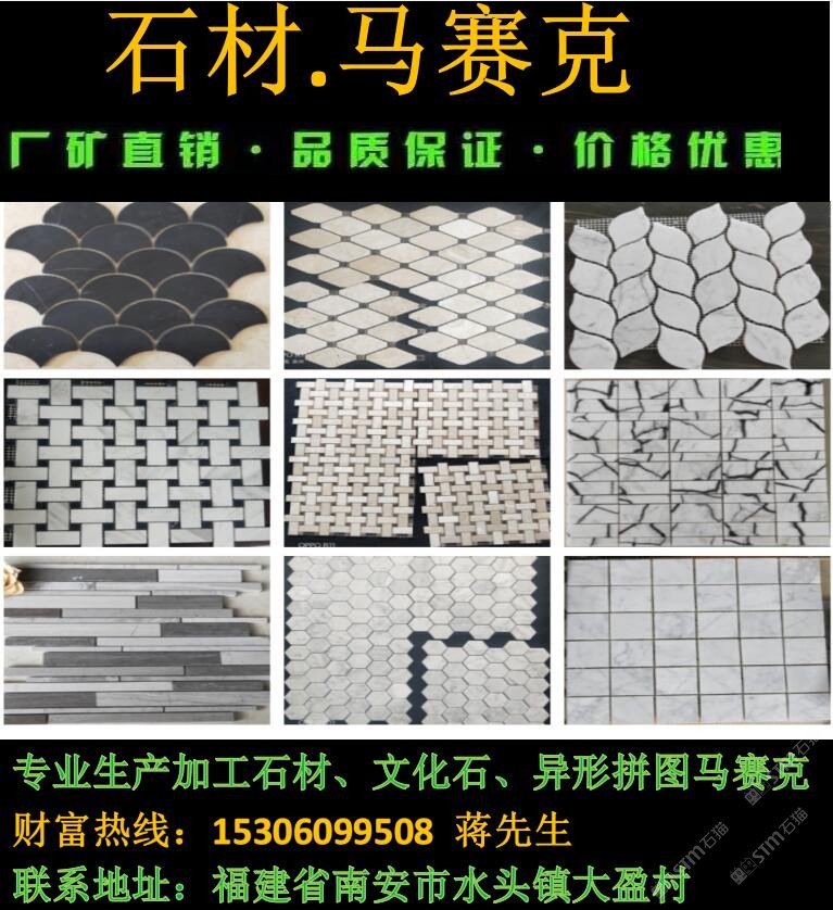 廈門摩恩石材馬賽克工廠是生產(chǎn)馬賽克、大理石、拼花、石線等石材的專業(yè)工廠,工廠成立15年誠信合作,價(jià)格公道,以質(zhì)量求生存,歡迎來廠參觀、詢價(jià)、考察下單。我們的工廠負(fù)責(zé)人蔣先生隨時(shí)恭候您的光臨,電話:15306099508,微信:15306099508 qq:1043118173