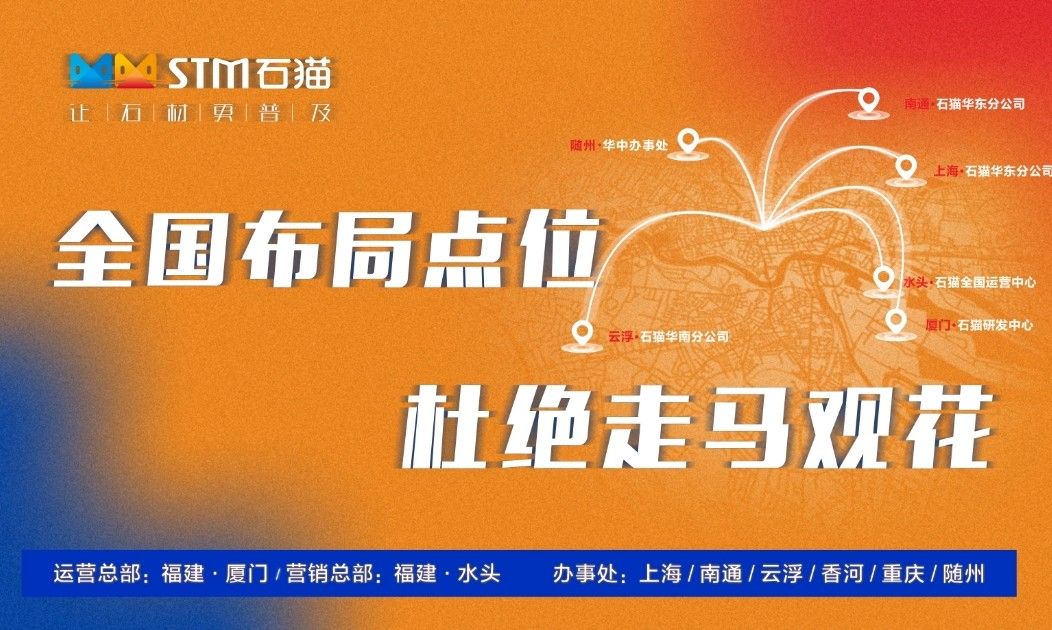 華東分公司先后與華東石材市場合作,包括上海東華環(huán)球石材市場、中首萬石國際石材市場、南通東升產(chǎn)業(yè)園、六泉國際石材市場等,隨后又與華東知名石材企業(yè)南通新景石材有限公司、隆川石材、康典石業(yè)、新鵬飛石業(yè)、宜興隆嘉石業(yè)、新澤海石業(yè)、南通杰恒石業(yè)、珍品玉石合作,打造共贏局面。石貓致力于與各大優(yōu)秀石企共同進(jìn)步,共同發(fā)展,尋求石材行業(yè)新發(fā)展。