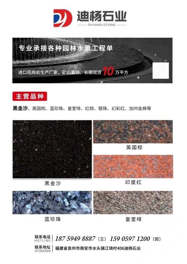 迪楊石業(yè)是一家專營進(jìn)口花崗巖,集石材加工銷售工程及出口貿(mào)易為一體的,主營黑金沙,印度紅,皇室啡,英國棕,綠星,銀珠,金鉆麻等各種進(jìn)口花崗巖,可承接外墻干掛,園林水景,地鋪家裝等各種異形加工,各種尺寸規(guī)格的大小工程單。歡迎來電咨詢