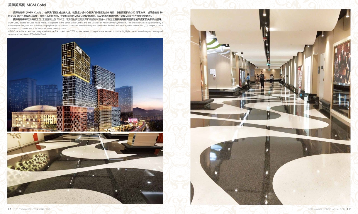發(fā)布信息: 美獅美高梅(MGM Cotai),位于澳門路氹城金光大道, 毗鄰金沙城中心及澳門東亞運(yùn)動(dòng)會(huì)體育館,總樓面面積約200萬(wàn)平方尺,設(shè)兩座樓高30層及36層的五酒店大樓,提供1390間客房。設(shè)施包括容納2000人的動(dòng)感劇院,LED屏幕構(gòu)成的世博廣場(chǎng)和2870平方米會(huì)議場(chǎng)地等。 美獅美高梅采用鴻海精工石,面積達(dá)到7800方。鴻海石材高潔的光澤和細(xì)膩的紋理進(jìn)一步彰顯出美獅美高梅典雅的氣度和非凡的品位。