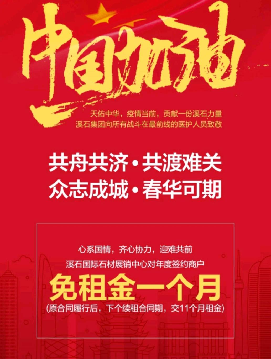 發(fā)布信息: [強][強]天佑中華,疫情當前,貢獻一份溪石力量 溪石集團向所有戰(zhàn)斗在前線的醫(yī)護人員致敬! 同舟共濟,共渡難關,眾志成城,春華可期! 溪石國際石材展銷中心對年度簽約商戶 免租金一個月[強][強]