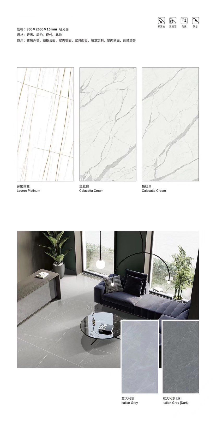 發(fā)布信息: ????SIBELAN 斯貝納巖板???? ????意大利設(shè)計(jì)師精選巖板???? 我們可以幫老總您加工為成品, 全國范圍內(nèi)可安排專業(yè)團(tuán)隊(duì)安裝. 做到您一次性采購 省心. 放心. 省時(shí). 低價(jià)! 巖板紋路版面全多達(dá)199 款 勵志做服務(wù)五星的巖板專業(yè)供應(yīng)商 魚肚白 雪花白 格蘭云天 寒江雪 爵士白 幻影灰 勞倫黑金 火山灰 亞馬遜 艾維拉 羅馬黑檀 貝特巖 細(xì)花白 羅馬灰 云朵拉灰 魚肚金 莎羅娜 莎羅蘭 勞倫白金 拉薩白 中花白 灰冰玉 卡拉拉白 撒金黑 清水玉 薩瓦灰 莎士比亞 大花灰 白冰玉 銀灰洞 阿瑪尼灰 綠紋玉 綠冰玉 藍(lán)紋玉 保加利亞灰 鐵銹 黑木紋 流砂灰 純白 純灰 純黑 TEL: 15905069590 聶 各種版面規(guī)格全部如下: 1200×600×11mm 啞光 1500×800×11mm 啞光 1800×900×11mm 啞光 1800×900×12mm 啞光 2600×800×15mm 啞光 2400×1200×6mm 啞光/亮光 2400×1200×9mm 啞光/亮光 2400×1200×15mm 啞光 2700×1200×6mm 啞光/亮光 2700×1600×12mm 啞光/亮光 3200×1600×6mm 啞光/亮光 3200×1600×12mm 啞光/亮光