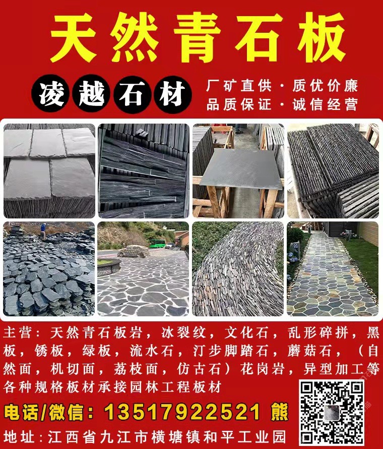 發(fā)布信息: 主營,冰裂紋,文化石,亂形碎拼,黑板,銹板,綠板,流水石,汀步腳踏石,蘑菇石,(自然面,機(jī)切面,荔枝面,仿古石)花崗巖 異型加工等各種規(guī)格板材承接園林工程板材。歡迎新老客戶的支持。購電話13517922521(微信同號(hào))