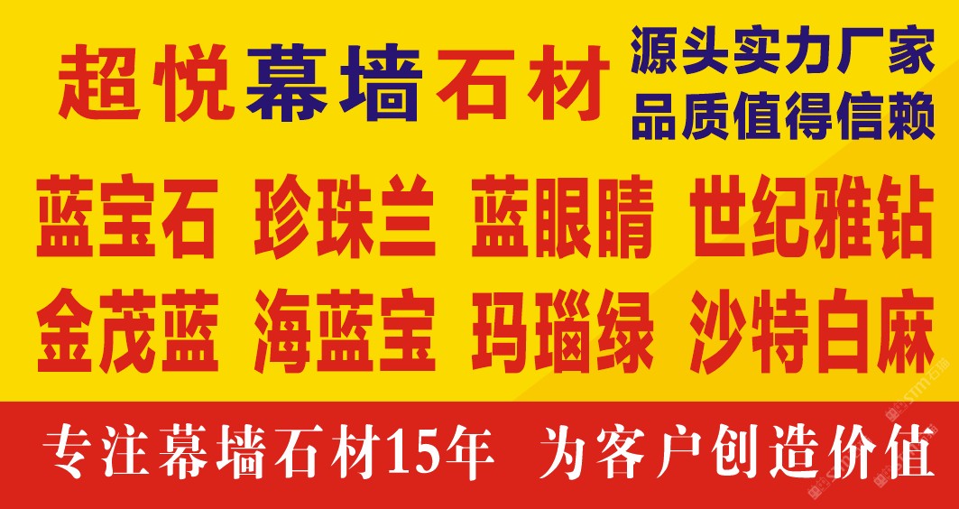 發(fā)布信息: 主營(yíng)藍(lán)色系列 源頭廠家直供 品質(zhì)值得信賴 藍(lán)寶石 藍(lán)眼睛 珍珠蘭 金茂藍(lán) 新世紀(jì)雅鉆 沙特白麻 專業(yè)生產(chǎn)1cm超薄板 2.5cm干掛板 專注幕墻工程15年 為客戶創(chuàng)造價(jià)值
